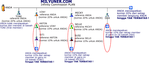 - Lalu, Anda mereferensikan MICKY, Anda mendapat komisi Rp 14.980,-. Kemudian MICKY mereferensikan SELVI, Anda mendapat komisi Rp 7.490,-. Kemudian SELVI mereferensikan SUSI, Anda mendapat komisi Rp 7.490,-....